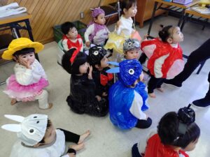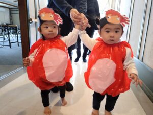 次にひよこ、りす、こあら組さん(0、1、2歳児)が表現遊び『大きなかぶ』を披露しました。ジブリのキャラクターに扮した子ども達が音楽に合わせて可愛く踊る姿に、その場にいた誰もが癒されました♡