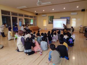 ロシアではパンケーキの上にいくらを乗せて食べたり、サワークリームを乗せて食べたりしているそうです。それを聞いた子ども達は「えー!」とビックリ。スライドを見ながら興味津々でお話を聞いていました。