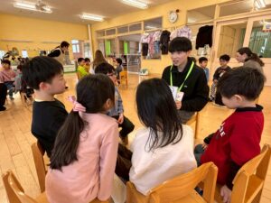 小さいクラスの子ども達は留学生さんと一緒におままごとをして交流しましたよ。