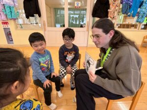 子ども達は韓国語、ロシア語、フランス語、で「おはよう」や「おやすみなさい」「イチゴ」等の言葉を耳で聞き、留学生さんの口の動きを見ながら真似して声に出していました。同じ意味でも、国によって言葉が全く違うことを感じることができたようです。
