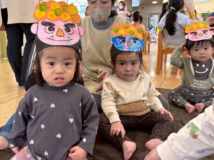 記念撮影の後は、どうして節分の日に豆まきをするのか?節分の日に食べる物などのお話を聞きました。当園では泣き虫鬼や怒りんぼ鬼…自分の心の中にあるイヤな鬼をやっつけます。節分のお話を聞いて「絶対に鬼をやっつける!」と心に決めていた子どもたちでした。