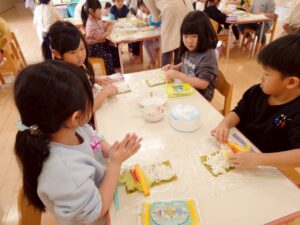 さらに大きいクラスのお友達は恵方巻作りに挑戦!スタッフの説明を聞きながら、卵やキュウリなどの具材をご飯の上にのせて、のりで巻きました。たくさんの具材をご飯と一緒に巻くのに苦戦していましたよ。