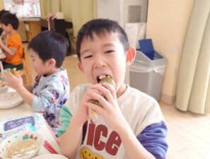 そして自分で作った恵方巻を今年の方角 南南東を向いて大きく口を開けてかぶりつきました。子どもたちは「美味しい!」と喜んで食べていました☆